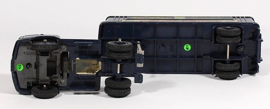An exquisite French Dinky articulated truck has a deep, original navy blue paint finish and cream roof. Made between 1967-69. Colourful, beautifully detailed labels on both sides are complete on both sides. Small ‘pam pam’ label at the rear is complete and fresh too. When detached, the chips where the trailer attaches to the chassis are evident (near unavoidable as metal slides against metal). Coupe of chips to the front bumper and the occasional mark may be found at some exposed edges.