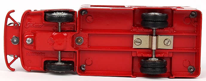 A fine example in vibrant unfaded red with a pleasing sheen, virtually complete – complete FALCK ZONEN lettering and crest, two blue roof lights, both rubber hoses stowed on the roof and reel at the side. Jewelled lights. Intact opening door with intact door catch. Detailed cast wheels and well-shaped original tyres.