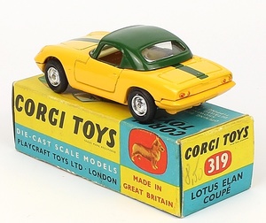 Corgi 319 Lotus Elan Coupe with detachable chassis. Very near mint/boxed. Very rare, final version with thin axles and plastic 'chromed' wheels. The only example we have ever handled! From The DC Collection.