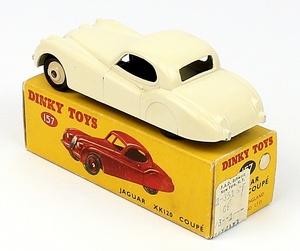 Dinky 157 Jaguar XK120 Coupe. Near mint plus/boxed. Scarce cream version, and rare with CREAM WHEELS (not fawn). A rare version from The DC Collection.
