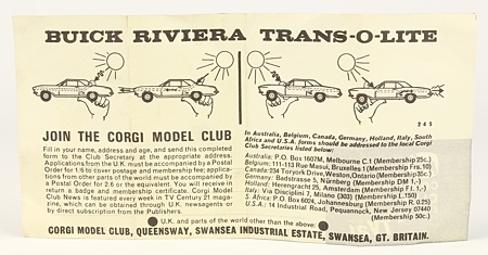 Corgi 245 Buick Riviera. Deep STEEL BLUE issue with DETAILED CAST WHEELS. Very, very near mint/boxed, with Leaflet. From The MBU Collection.
