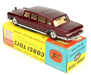 Corgi 247 Mercedes Benz 600 Pullman. Very near mint/boxed. Deep metallic reddish-maroon version. Complete with intact bonnet emblem and Instruction Leaflet. From The MBU Collection.
