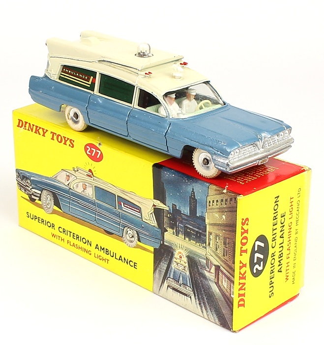 Dinky 277 Superior Criterion Ambulance with Flashing Light. Version with clear roof light & matte base, light green interior. Near mint plus/boxed, with packing piece & Leaflet. From The Reference Collection.