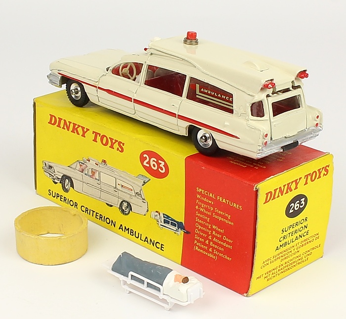 Dinky 263 Superior Criterion Ambulance. Off-white version with matt baseplate and RED INTERIOR. Scarce. Near mint plus/boxed. Stretcher figure & packing ring included. From The Reference Collection.