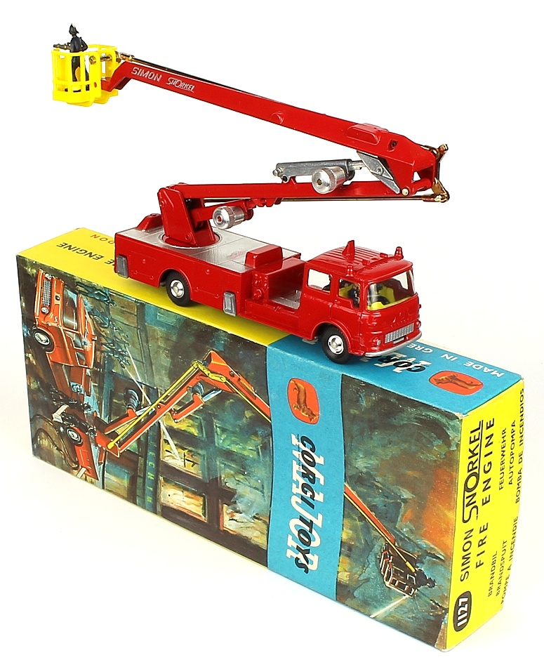 The Simon Snorkel fire engine was made between 1964-74. This example has a Bedford cab, spun wheels, 6 firemen, water cannon, extending and rotating boom. Original fine tread tyres run well. Version with gold boom jointed pipes.