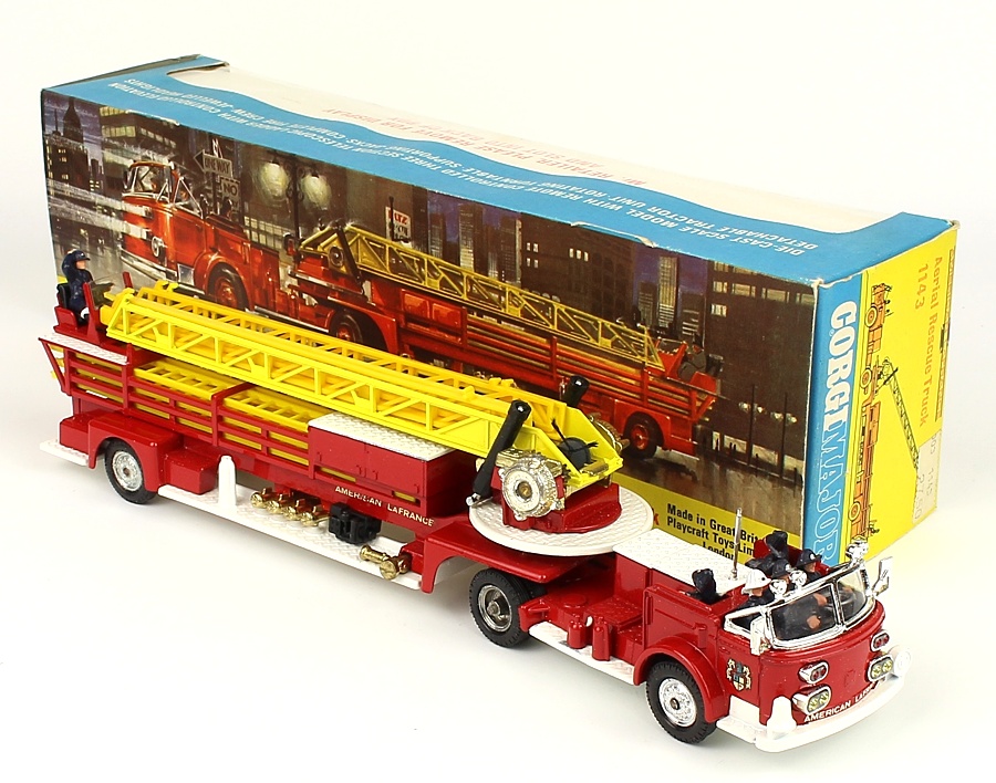 Corgi 1143 American La France Aerial Rescue Truck. Red & white issue with silver wheels. Very near mint/boxed with Leaflet & Retailer Card. From The Old School Collection.
