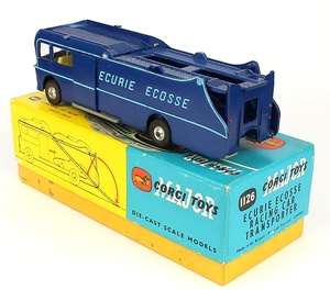Corgi 1126 Ecurie Ecosse Racing Car Transporter. Near mint plus/boxed. Later version with RAISED BLUE LETTERING. With card packing. From The Edinburgh Collection.