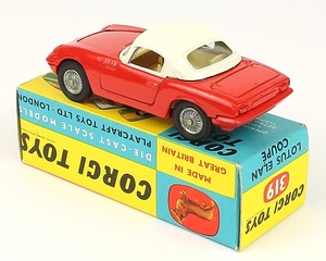 Corgi 319 Lotus Elan Coupe. Very near mint/boxed. Red & white version with Instruction Leaflet/Corgi Club Membership Form (crisp!). Very fresh box.