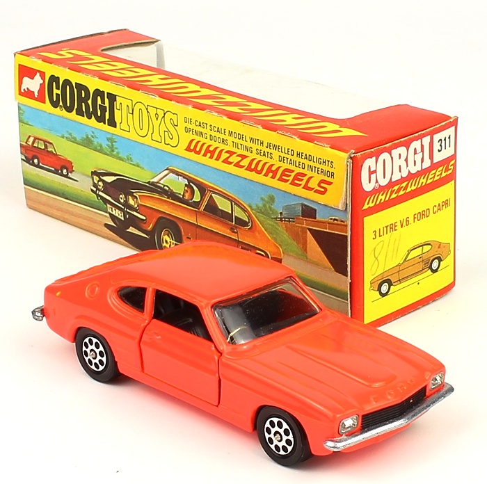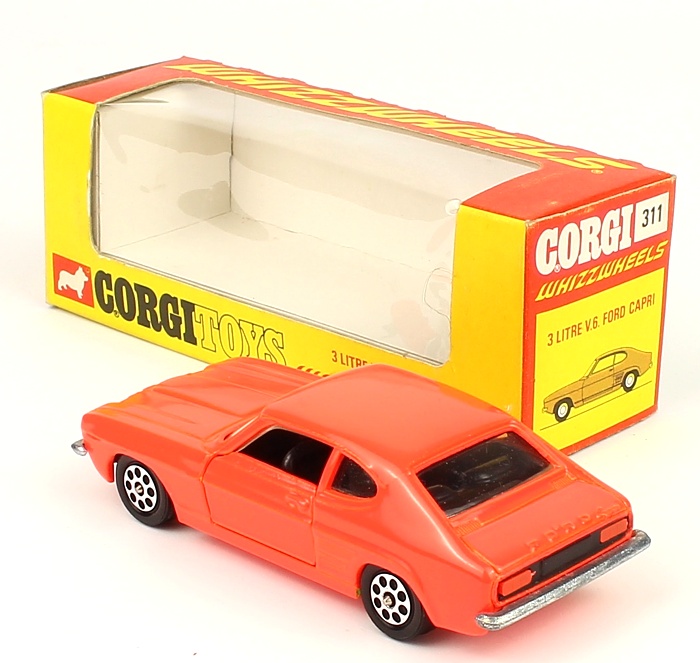 Corgi 311 3 Litre V6 Ford Capri. Very near mint/boxed. Fluorescent orange with 'Pepper-pot' Whizzwheels. From The Old School Collection.