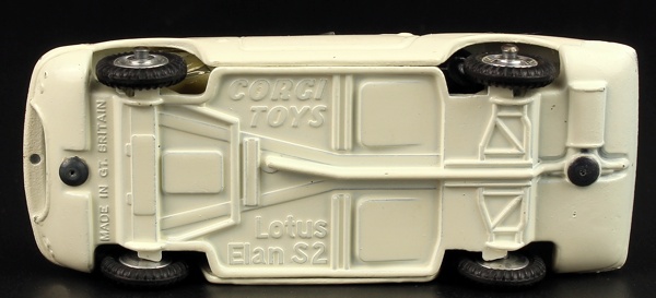 Corgi 318 Lotus Elan S.2. Very near mint/boxed. Scarce version in white with 'Tiger' logo. Complete with unapplied racing numbers & shaped packing piece. From The Old School Collection. Bids are invited on this model - please see the relevant section on our Faq Page. QDT starting bid £300.