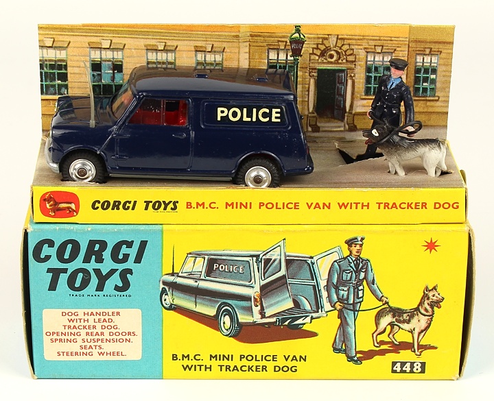 Corgi 448 B.M.C. Mini Police Van with Tracker Dog. DEEPEST BLUE & SPUN WHEELS issue. Very near mint/boxed, with packing. From The Reference Collection.