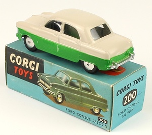 Corgi 200 Ford Consul Saloon. Near mint plus/boxed. Scarce two colour issue in GLOSS oyster over bright green. From The Berlin Collection.