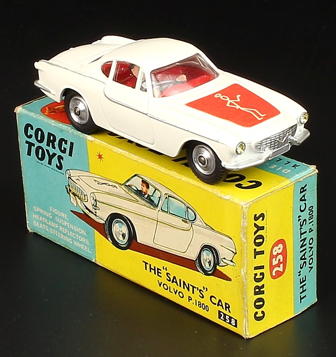 Corgi 258 The "Saint's" Car Volvo P.1800. With matchstick figure on orange-red label, shaped spun wheels. Scarce issue. Very near mint/boxed (wear). From The Heart of England Collection.