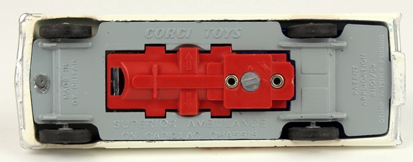 Corgi 437 Superior Ambulance on Cadillac Chassis. Blue & white, spun wheel issue. Red roof light & clear indicators. Very, very near mint/boxed (with over-flash label). With Instruction Leaflet & card packing piece. From The Old School Collection.