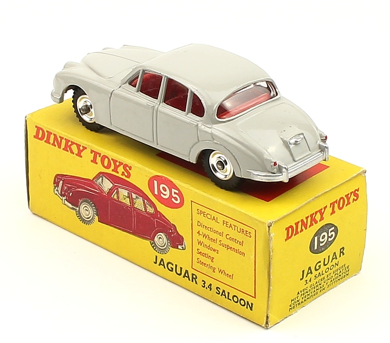 Dinky 195 Jaguar 3.4 Saloon. Pale grey issue with red interior, spun wheels. Near mint plus/boxed. From The Berlin Collection.