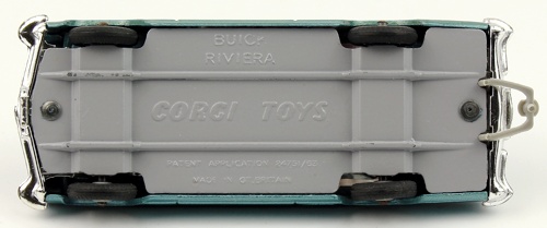 Corgi 245 Buick Riviera. Scarce metallic GREENISH-BLUE issue with DETAILED CAST WHEELS. Very near mint/boxed. From The Berlin Collection.