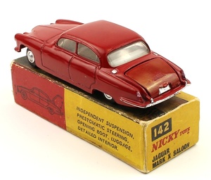 Nicky/Dinky Toys 142 Jaguar Mark X Saloon. DARK RED (non metallic) version. Very near mint/boxed with 2 pieces of luggage. Scarce. From The Cumbrian Collection.
