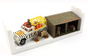 ’Zebra-striped Land-Rover with an intact circular ‘LIONS OF LONGLEAT’ label on the bonnet. Opened hatch on the cab roof shows the keeper complete with the (usually missing!) rifle. Bright cast wheels with suspension. Plastic tow hook (earlier version with spun wheels has a metal tow hook).