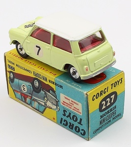 Corgi 227 Morris Mini-Cooper Competition Model. Lemon with white roof only. Scarce. Bold racing number 7. Very near mint/boxed. From the 'Exclusively Mini' Collection.
