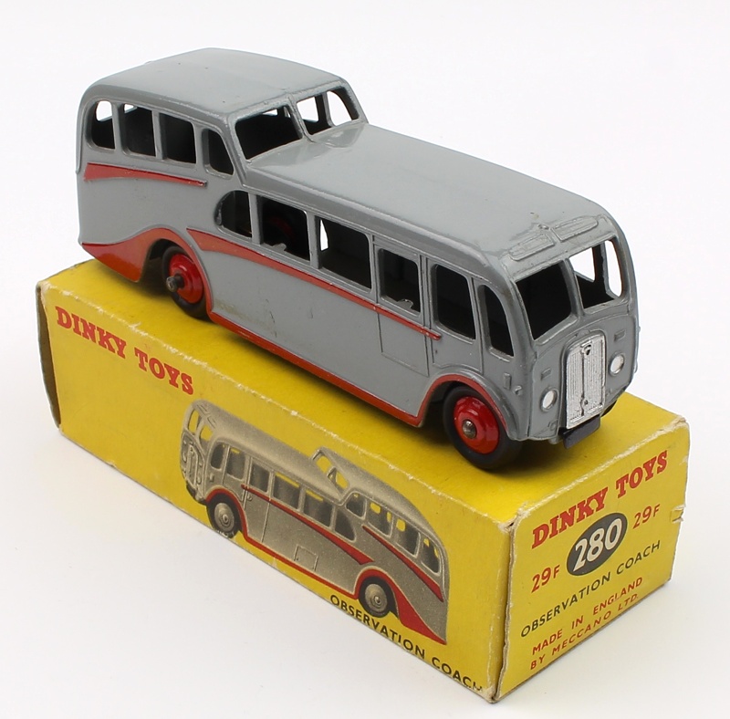 Dinky 29F/280 Observation Coach. Grey with red flash and wheels. Very near mint/boxed. From The Cumbrian Collection.
