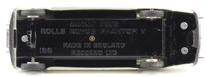 Issued between 1962-68. A most attractive Rolls Royce model with a cream lower and a pale metallic green upper body. Pale blue-grey interior with chauffeur. Notably complete with an intact bonnet emblem and shiny chrome-plated trim (over-rider rubs). The windows can be raised or lowered. Shaped spun wheels and a bright baseplate. Original tyres run well. Model has prestomatic (i.e. fingertip) steering. Suspension.