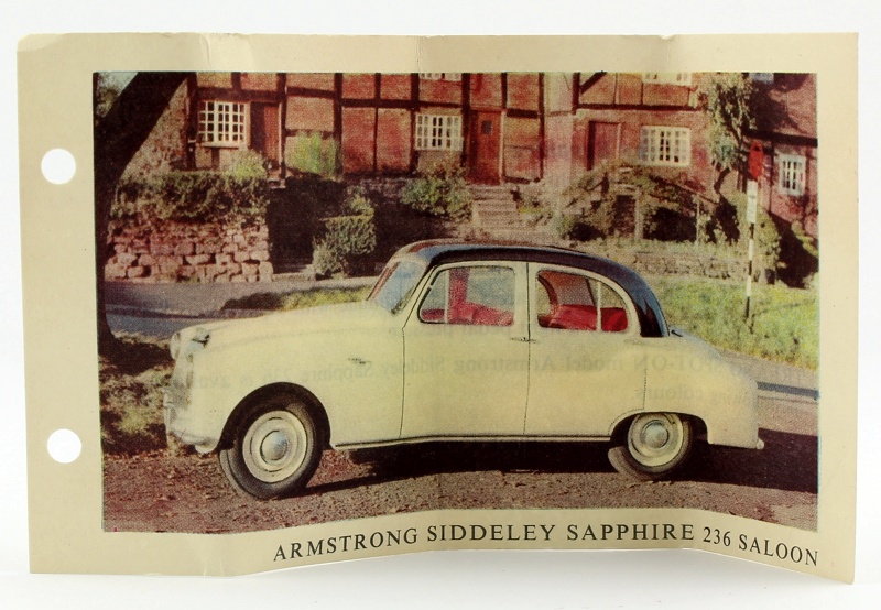 Issued in 1959, this Armstrong Siddeley model has a distinctive lavender blue and black finish, an intact bonnet emblem and virtually complete number plates front and rear (tiny edge nick at the rear number plate). Bright red interior, ivory steering wheel.