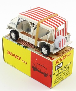 Dinky 106 'The Prisoner' Mini-Moke. Scarce version with CHROME windscreen frame & deep brown running boards. Mint/boxed. From the 'Exclusively Mini' Collection. Bids are invited - please see the relevant section on our Faq Page. QDT starting bid £175. Please note that QDT apply 10% buyer's commission, with a ceiling of £100. Please quote Prisoner No.1 when bidding.