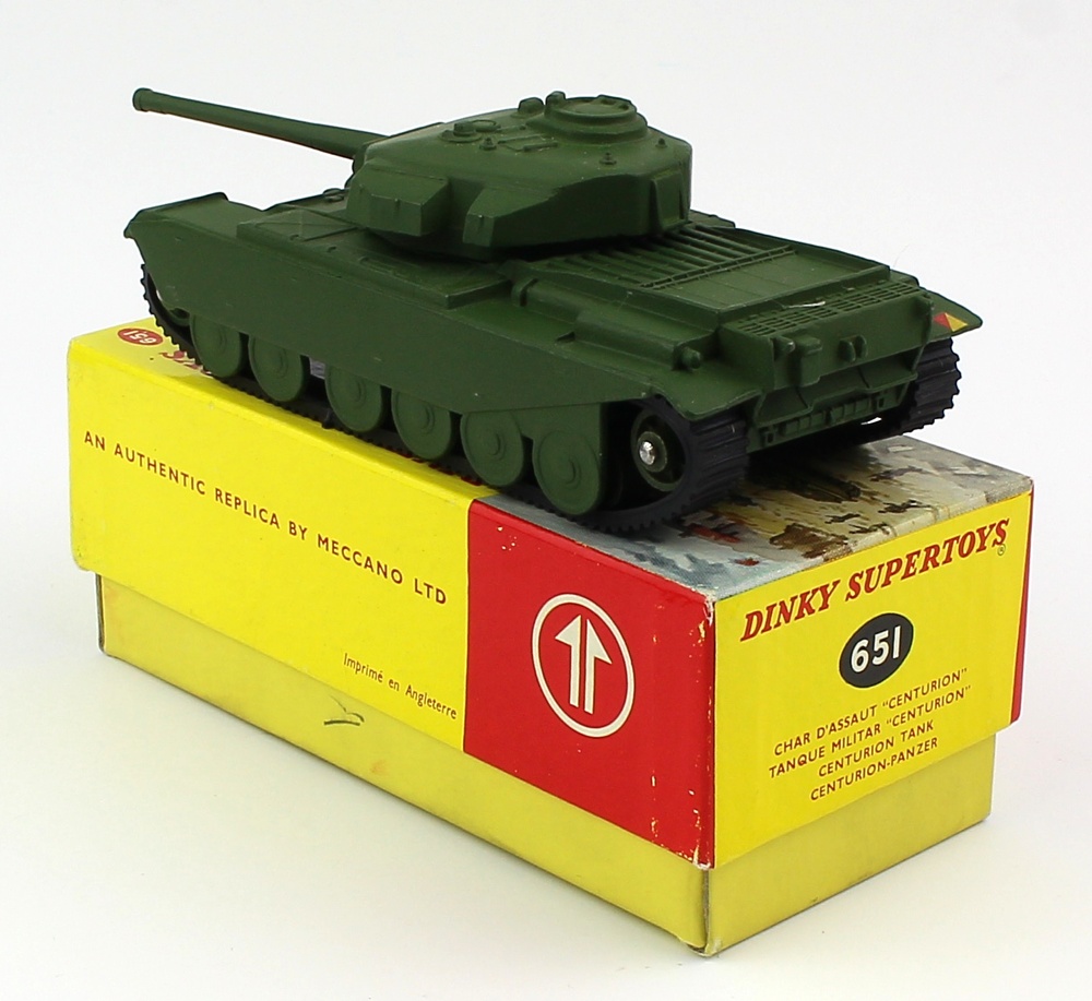 Dinky 651 Centurion Tank. Scarce matt military green version. With rivetted base. Very, very near mint/boxed. With card packing. From The Reference Collection.