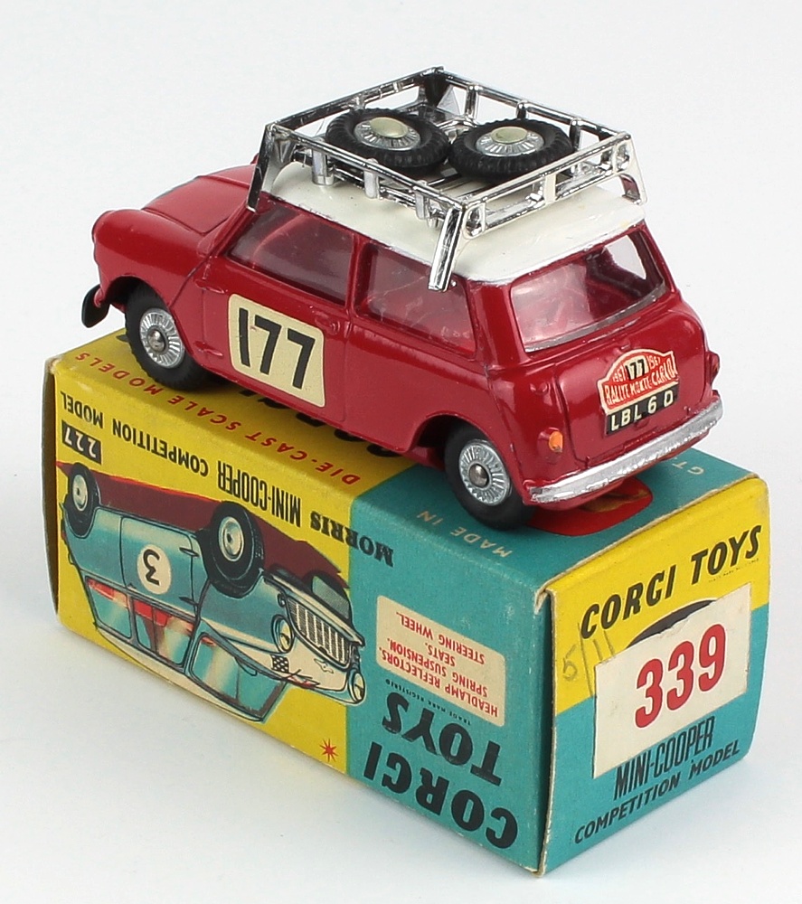 Corgi 339 1967 Monte Carlo Winner B.M.C. Mini Cooper 'S'. Very near mint/boxed. Cast wheels issue in lovely 3-PIECE over-flashed 227 card box. With leaflet. Scarce model from the 'Exclusively Mini' Collection. Bids are invited - please see the relevant section on our Faq Page. QDT starting bid £200. Please note that QDT apply 10% buyer's commission, with a ceiling of £100.