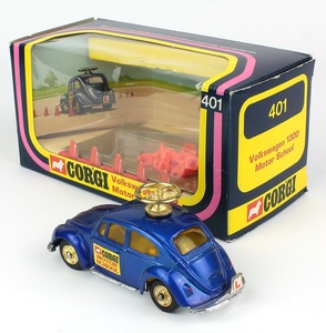 Corgi 401 VW 1300 Motor School Car. With sealed blister pack of cones, with gold card base. Very near mint/boxed. From The Old School Collection.