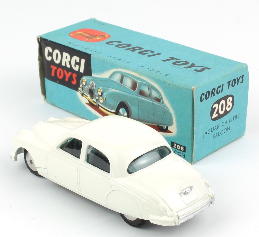 Corgi 208 Jaguar 2.4 Litre Saloon. Scarce white version with green-tinted glass. Very, very near mint/boxed. From The Reference Collection.