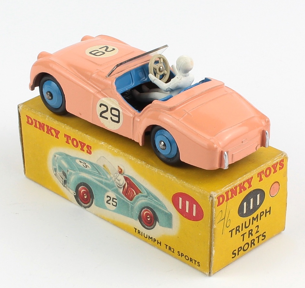A very fine, very close to perfect example issued between 1956-59 in salmon pink (competition) finish, racing number 29. Bright mid-blue seats and hubs, white driver.