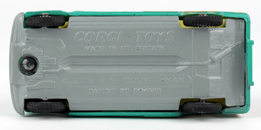 Issued between 1965-69, this popular Mini model has a sea-green finish, ‘wood panelling’, yellow interior, jewelled headlights, aerial, shiny gold roof-rack with two surf boards, and surfing figure.