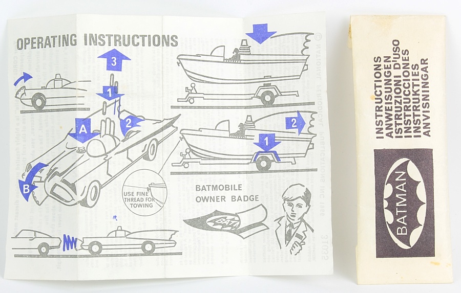 Corgi 267 Batmobile. Whizzwheel 8-spoke wheel issue. Palest deep blue screens. Very near mint/boxed (early 'narrower' box issue) . With Instruction Packet (lacks Badge). From The Old School Collection.