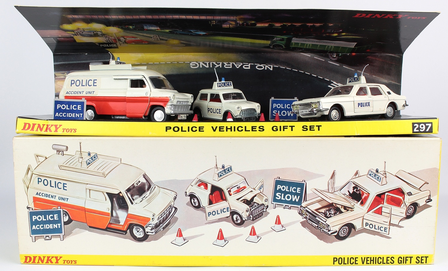 Dinky Gift Set 297 Police Vehicle Gift Set. Very near mint/boxed, with 2 white card packing pieces. With cones and police signs. Scarce. From the 'Exclusively Mini' Collection. Bids are invited - please see the relevant section on our Faq Page. QDT starting bid £200. Please note that QDT apply 10% buyer's commission, with a ceiling of £100.