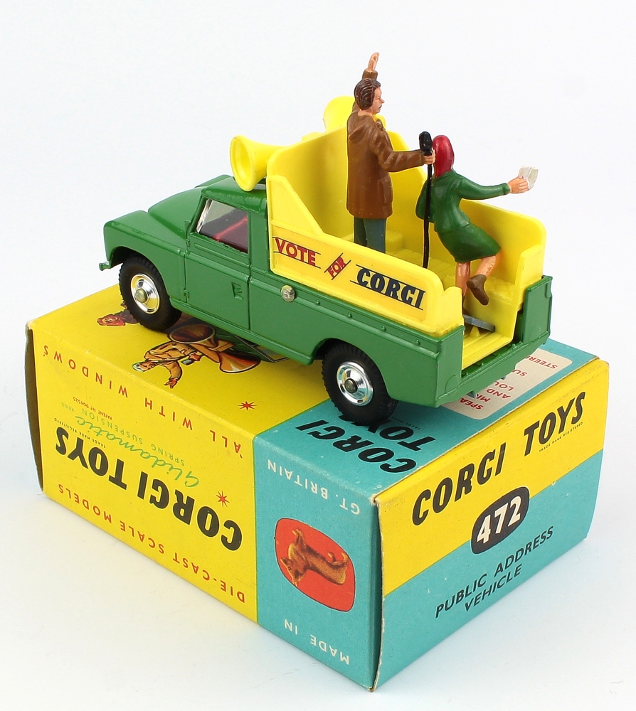 Corgi 472 Public Address Vehicle "Vote For Corgi". Mint/boxed. With both card packing pieces and both figures. From The Inverness Collection. Bids are invited - please see the relevant section on our Faq Page. QDT starting bid £150. Please note that QDT apply 10% buyer's commission, with a ceiling of £100.