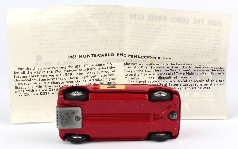 Corgi 321 Mini Cooper 'S' Monte Carlo 1966 with roof signatures, racing number 2. Very, very near mint/in 321 box with 1966 flash label. Scarce. With Leaflet. From the 'Exclusively Mini' Collection. Bids are invited on this model - please see the relevant section on our Faq Page. QDT starting bid £200. Please note that QDT apply 10% buyer's commission, with a ceiling of £100.