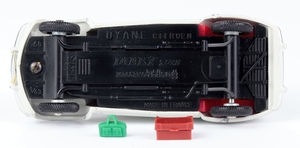Issued between 1968-70, this Citroen model comes in a delicate shade of palest grey with a matching plastic roof. Bright red interior, suspension on anodised (not shiny spun) wheels. Original silver detailing at radiator and bumpers, rear red lights detail, number plates front and rear. Opening hatch. Opening bonnet reveals a detailed engine and spare wheel.