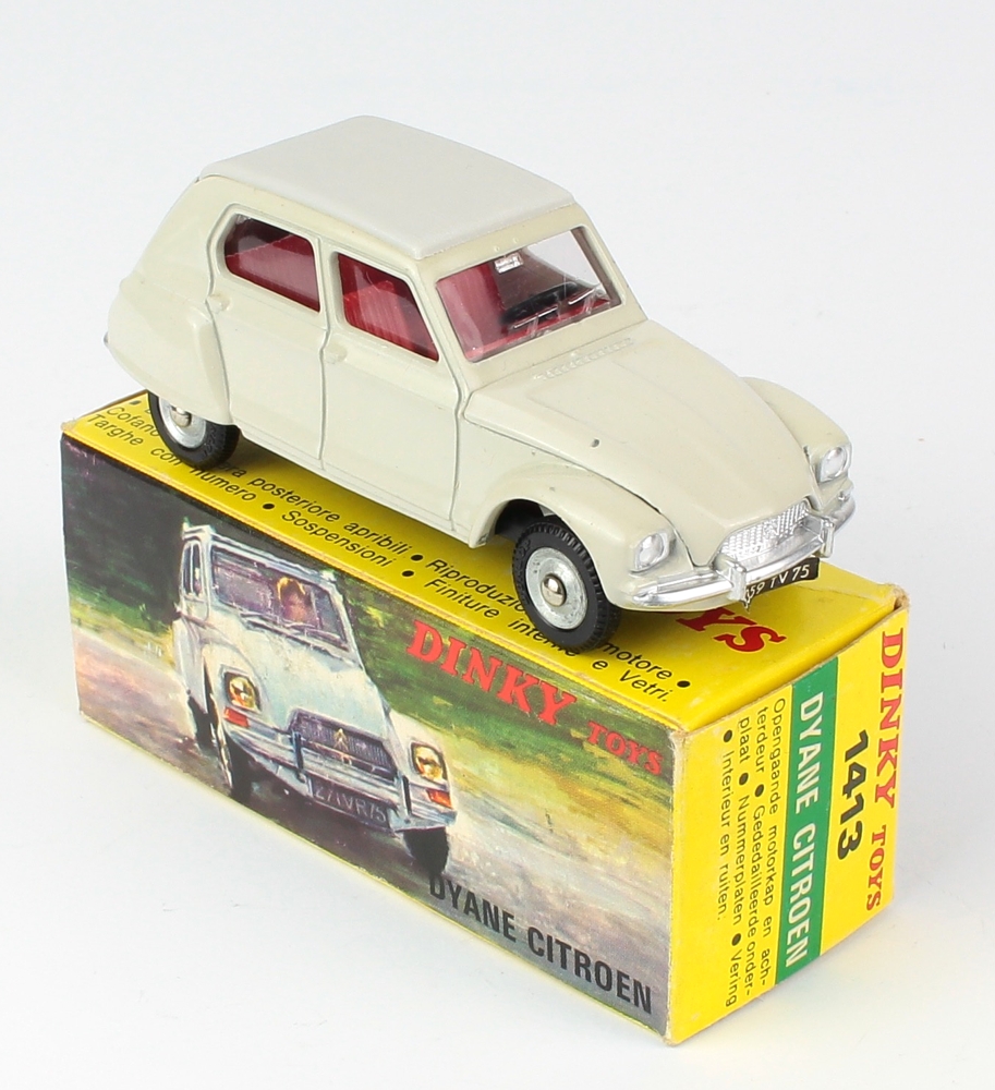 French Dinky 1413 Citroen Dyane. Very pale grey, version with ANODISED WHEELS. Very near mint/boxed. With luggage. From The MBU Collection.
