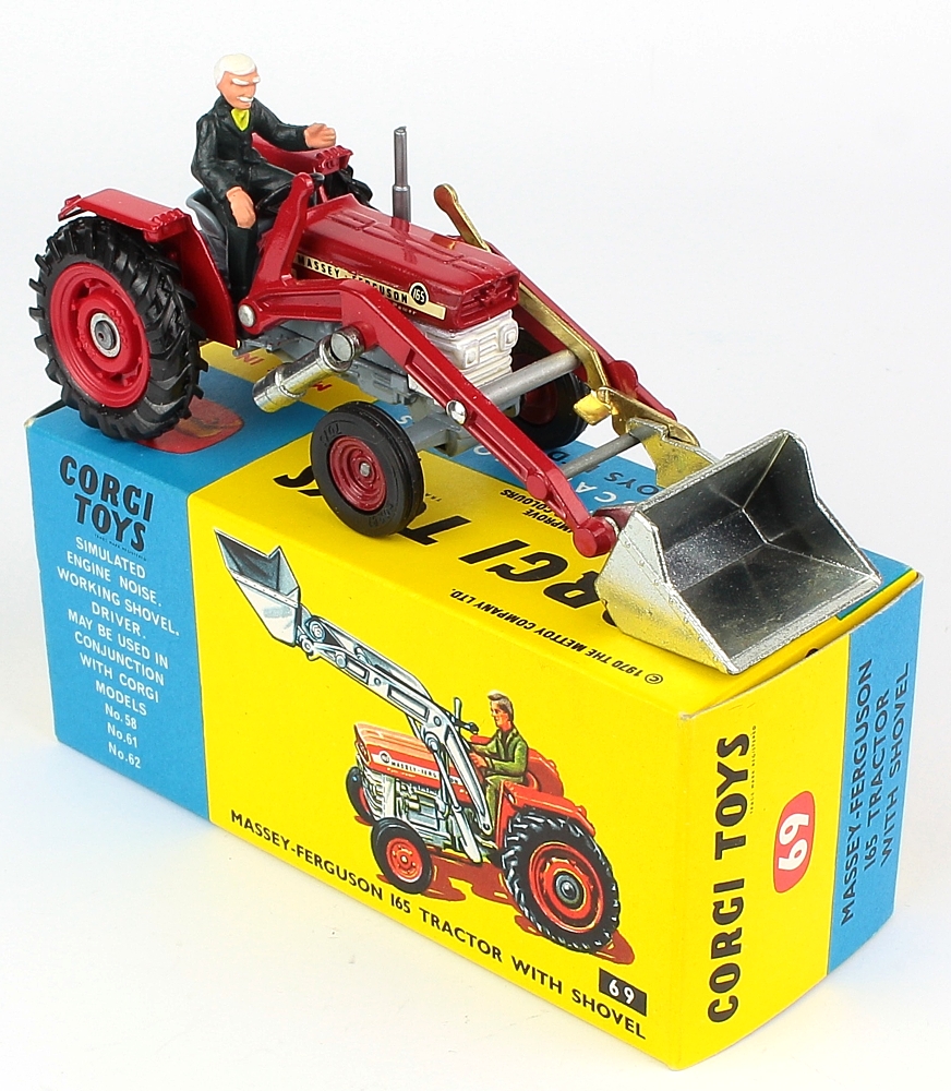 Corgi 69 Massey-Ferguson 165 Tractor with Shovel. Very, very near mint/boxed. Version with GRAY plastic chimney. Outstanding, fresh box with card packing. From The Old School Collection.