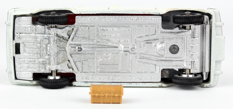 Issued in various colour finishes including the promotional colours, this model is a more difficult find in white with a mid-blue roof*. Red detailed interior, white steering wheel, opening bonnet and boot, suspension on shining spun hubs, ‘Prestomatic’ steering, as-new original tyres.