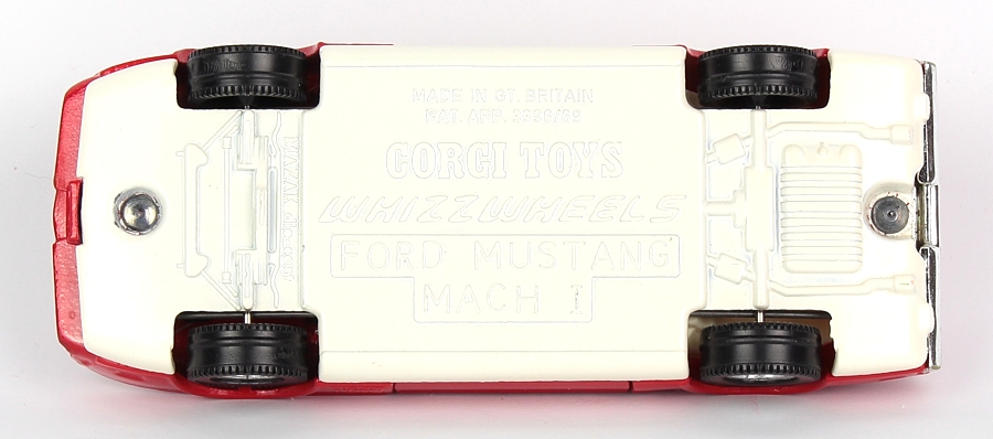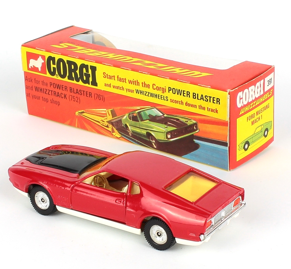 Corgi 391 James Bond Ford Mustang Mach 1. With UNPIERCED SPOKED WHEELS. Near mint plus/boxed Complete PALE LEMON James Bond Label - not sunfaded). Really fine box! Inspired by the film 'Diamonds are Forever'. From The Old School Collection.