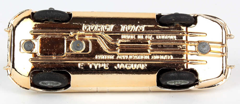 A striking Corgi model issued between 1964-68 with a deep gold-plated finish, black interior, intact original windscreen, racing driver, steering wheel. Suspension on detailed spoked wheels. Well-shaped original tyres with fine tread.