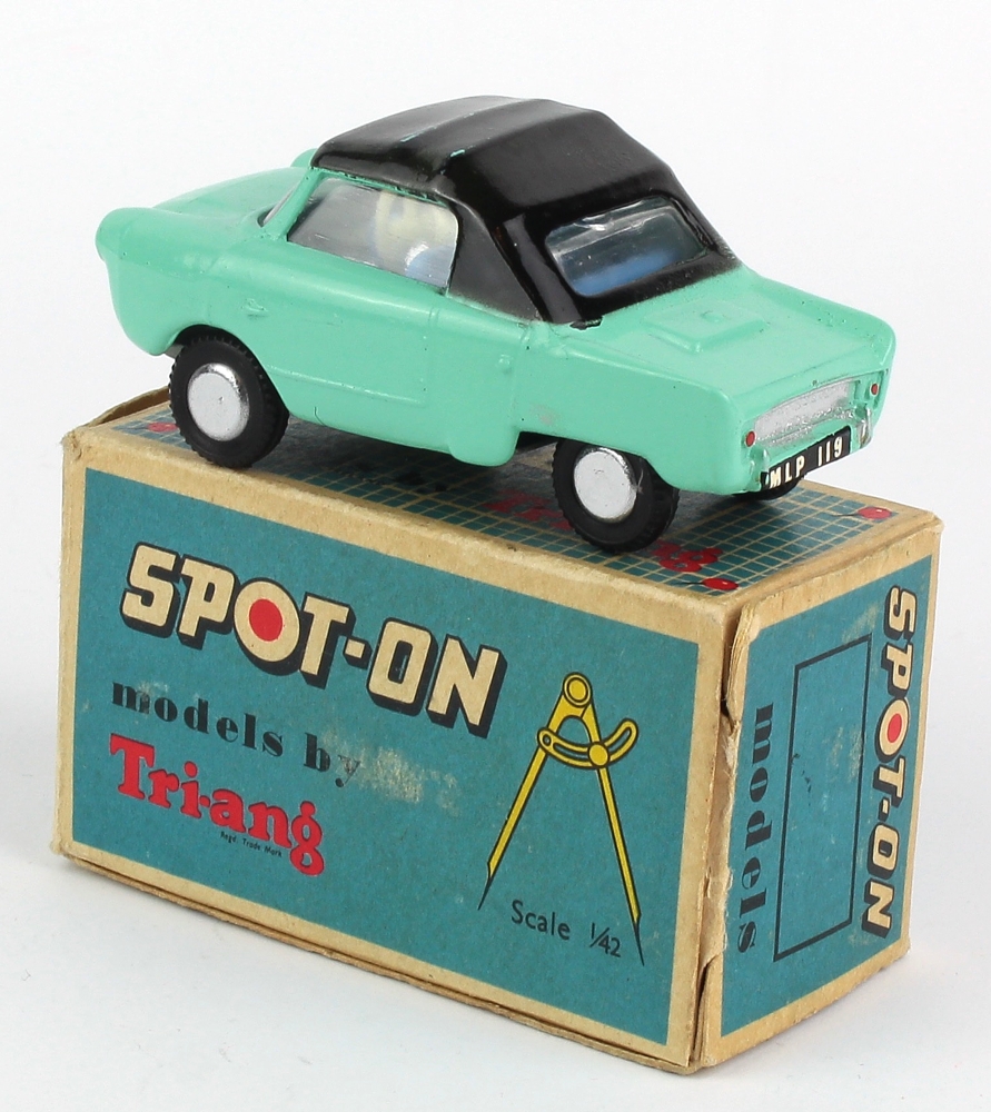 A charming car from the Spot-On manufacturer in eye-catching turquoise with a black roof.
