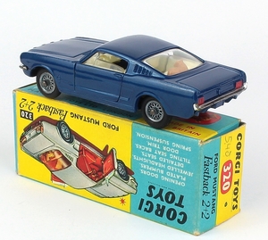 Corgi 320 Ford Mustang Fastback 2+2. Very near mint/boxed. Deep metallic blue version. Spoked wheels. From The Old School Collection.