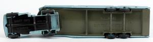 A difficult find This Pullmore Car Transporter was made for such a short time with six rivets (usual version has four) during 1953. This example is in all original condition with a light blue cab and chassis, mid-blue wheels, darkest grey-fawn decks. Black radiator and bumper. Complete ‘Dinky Toys Delivery Service’ on both sides and at the rear. Presents well with a pleasing lustre. Well-shaped smooth black original tyres.