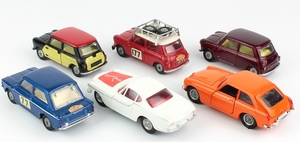 7) Corgi 339 Mini Cooper ‘S’ Monte Carlo in red and white with chrome roof rack and two spare tyres. THIS IS THE LATE MORRIS ISSUE WITH LARGE HEADLIGHTS. Complete racing numbers (minor age transparency). Intact rear number plates, front number plates have a central nick. Complete Monte Carlo labels at the front, small nick to the rear label. Couple of little rear bumper marks.
