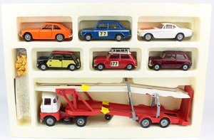 Corgi Gift Set 48 Car Transporter with 6 Cars. Near mint plus-very, very near mint/boxed. Hardest to find of all the Gift Set 48 versions - this is the last issue with an ALL-YELLOW card box front. With Retailer Card. Includes the rare ORANGE MGC GT, & RED LABEL version of The Saint's Volvo. With sealed bag of cones, unapplied racing numbers and Leaflet. From the 'Exclusively Mini' Collection. Bids are invited on this model - please see the relevant section on our Faq Page. QDT starting bid £500. Please note that QDT apply 10% buyer's commission, with a ceiling of £100.