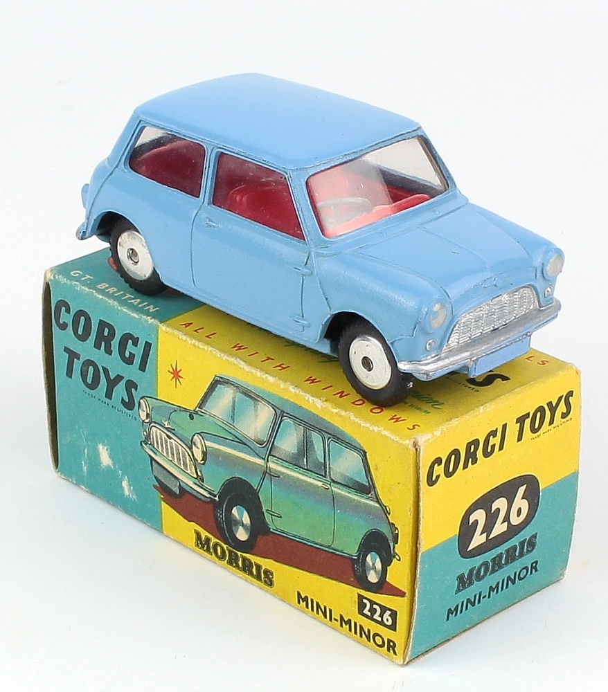 Corgi 226 Morris Mini Minor. Near mint plus/boxed. Light greyish-blue issue with a red interior, 'open' axles & flat spun wheels. From the 'Exclusively Mini' Collection.