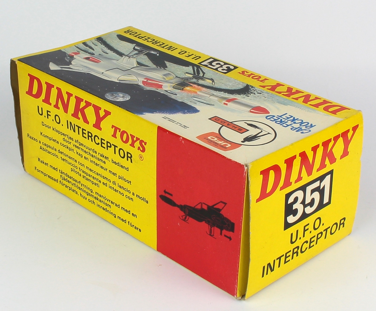 Dinky 351 SHADO UFO Interceptor. Gerry Anderson inspired model. From the TV series 'U.F.O'. Orange legs version with CLEAR COCKPIT GLASS & chrome INTERIOR. Very, very near mint/boxed, with packing, leaflet & Dinky Catalogue. From The Mayfair Collection. Bids are invited on this item - please see the relevant section on our Faq Page. QDT starting bid £200. Please note that QDT apply 10% buyer's commission, with a ceiling of £100.